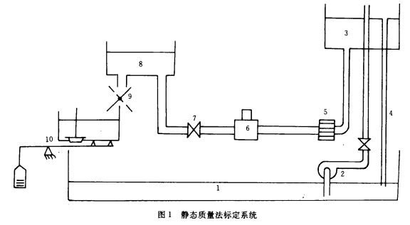 静态标定设备一般由液体恒压源、计量器、计时器和同步机构组成。其中计量器用标准容积时称为容积法;使用地上衡或地中衡直接测出质量流量时称为质量法。由于地上(中)衡精度较高,所以质量法标定精度较高,一般误差为±0.05%~0.2%,而容积法为±0.2%~0.4%。图1为静态质量法标定系统。图中,1一储液池(水或其它介质);2一泵;3一液塔;4一溢出管;5一整流器;6一被校涡轮流量计;7**量调节阀;8一背压装置;9一换向器;10一地上衡。其中被校涡轮流量计之前的直管段长度应为管径的30~50倍;之后的直管段应为管径的10~15倍。整流器的作用是保证进人涡轮流量计的流态,消除旋转流对测量的影响,流量调节阀应装在流量计之后,避免阀门对流量扰动带来误差。标定时使用精度高德石英晶体电子秒表测量换向器2次动作之间的时间,地上衡测出这段时间流过流量计的液体质量,即可求出质量流量。由于测质量时被测液体处于静止状态,故称静态质量法。
