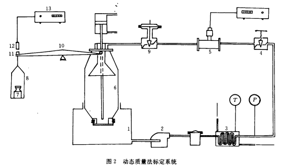 由于静态法必须等待容器中的液体静止后才能测量,另外容器中不能存在残留液体,所以效率低,动态标定法是在液体流动情况下进行质量或容积测量:一般先把容积或质量固定,只测量时间,操作简便,效率高。图2为1种动态质量法标定系统,可在连续运行状态下对流量计进行标定。其工作过程为:打开主泵2.使油液在回路中循环;调节油温控制器3.使油液达到标定温度;调节流量调节阀4.使被校流量计5.指示标定刻度;流场稳定后先在祛码盘8中加起始质量祛码,秤10失去平衡;按标定按钮,计量油箱6底部放泄阀关闭、计时、计数器13回零,开始充液;随着计量油箱中油液增加达到起始质量时,秤10恢复平衡,执行元件11触发传感器12.使计时、计数器13开始计时计数;再将一标准质量砝码加于砝码盘8中,秤10又失去平衡;继续充液,当*二次达到平衡时,再次触发传感器12.使计时、计数器停止工作。由所计时间t和质量即可求出质量流量。一个循环结束后,放泄阀自动打开,计量油箱中的油液放到主油箱1中.整个标定过程中,只需人工调节流量阀,加2次固定质量的标准祛码。每次循环时间1~2min,效率较高。另外计量油箱全部质量支在秤上,不与管路系统有刚性连接,因此精度高。为了防止油液冲击影响测量精度,计量油箱中采取了防冲击措施。