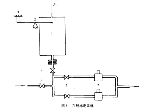 在生产系统或实验系统上附设流量标定装置,在不影响生产或实验工作情况下进行标定称为在线标定。若每次对流量进行检测时都**进行标定即为实时标定或称实时校准,实时标定可以消除各种参数的变化对测量精度的影响。图3为质量法在线标定系统,它附设在工作系统中,可以进行实时标定。处于工作情况时,打开开关4、5、6,,油液通过涡轮流量计7去工作系统,同时通过开关5充往计量油箱1,计量油箱与液体管道无刚性连接,全部质量通过杠杆2作用在力传感器3上,计量油箱充一定的油液后在传感器输出信号控制下关闭开关5,作好标定准备。标定时,打开开关5,关闭开关4,此时计量油箱中的油液在计量油箱上方提供的一定气压P1驱动下经过被标定流量计进人工作系统。此时只需测出力传感器测出的起始质量M1到终了质量M2之间的时间就可得到质量流量,达到终了质量M2后,自动打开开关4,恢复正常工作状态,该系统在计算机控制下很容易实现,并立即求出实时的仪表常数,计算机每次采集流量数据之前按上述过程进行一次实时标定。然后进行数据采集,按实时标定的仪表常数进行数据处理。