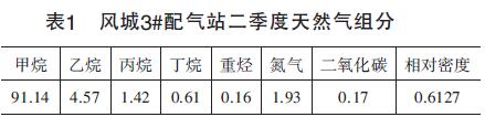 2015年7月,新疆油田公司风城3#配气站的涡轮流量计在现场验收时就进行了此项内容的验证,对该站在用的3套分体式温压补偿型气体涡轮流量计(双显示式)分别选取了3组数据(工况压力、工况温度、工况压缩系数、标况压缩系数、工况流量、标况流量),将流量计测量的标况流量与由气态方程计算出的理论标况流量进行对比,得出两者误差,根据误差判断在传输过程的失真程度。按**标准要求对风城3#配气站取样得到的天然气组分报告,详细数据如表1所示。根据表1中的天然气组分,以及介质的工作压力、工作温度可计算出工况压缩系数Zg,根据**标准中天然气标准参比条件,可计算出标况压缩系数Zn。